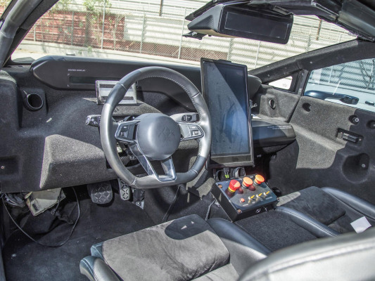 The prototype’s interior is bare with limited fit and finish. The seats are bolted to the floorboards and the door panels are covered in the same material as used on the floor. But that said, there’s a steering wheel and a large screen, but it’s unclear if the screen works.